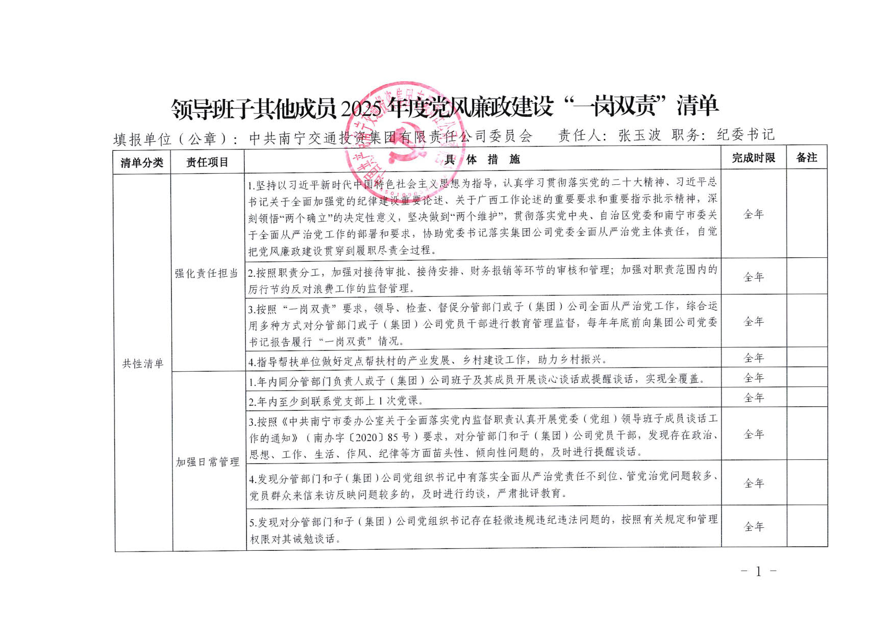 南寧交投集團(tuán)領(lǐng)導(dǎo)班子其他成員2025年度黨風(fēng)廉政建設(shè)“一崗雙責(zé)”清單(一)